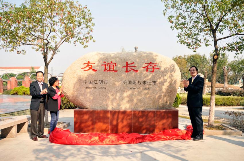江陰-阿拉米達友城締結五周年紀念碑揭碑儀式在我市徐霞客中學舉行