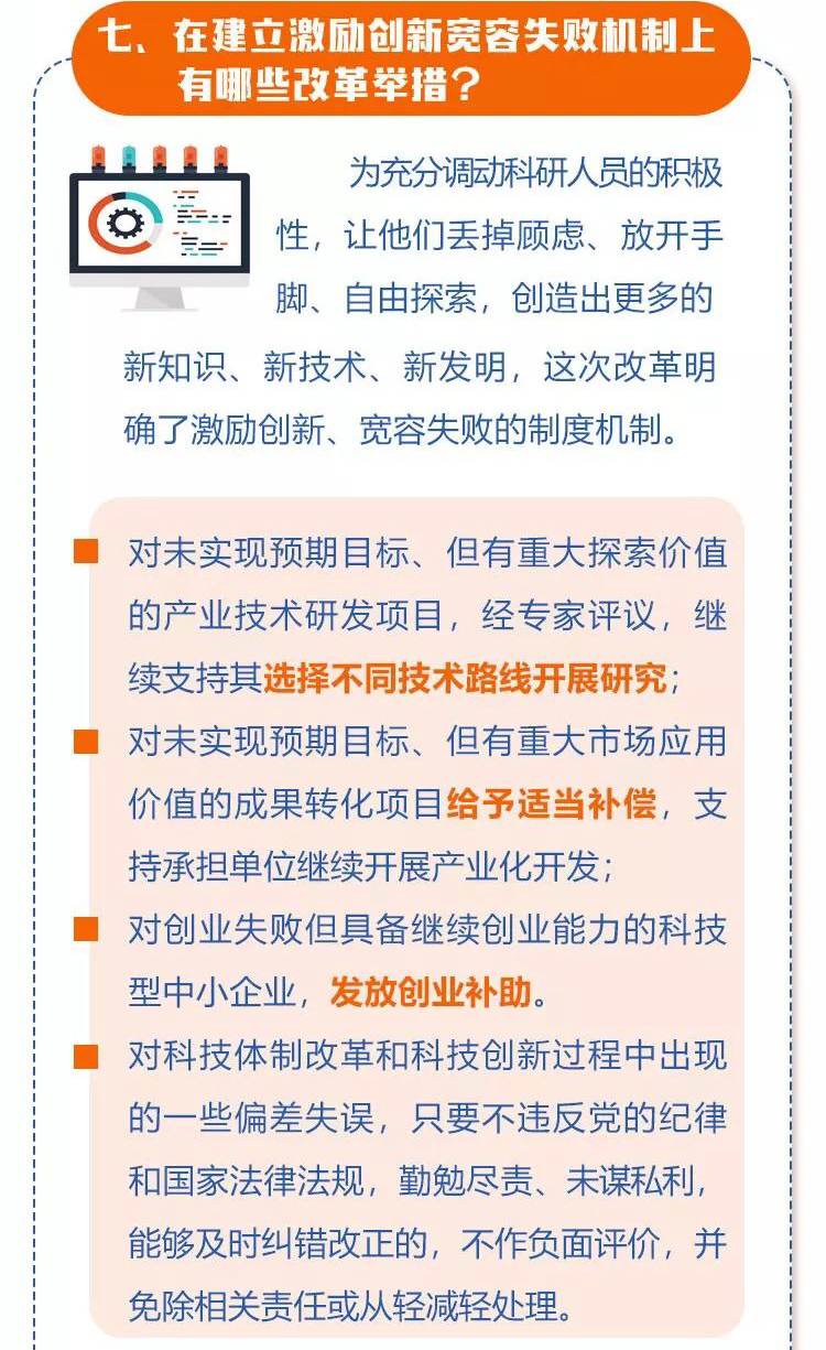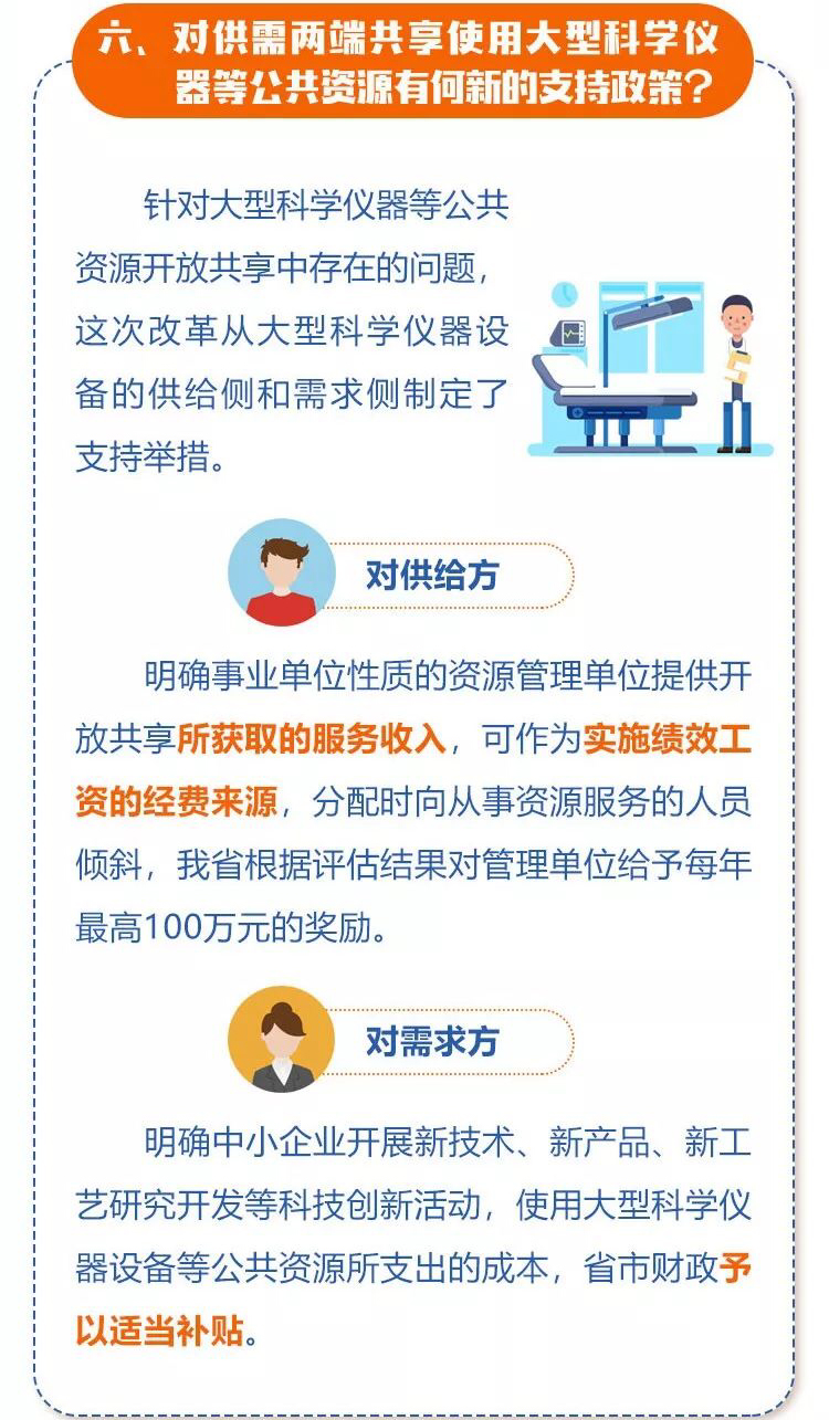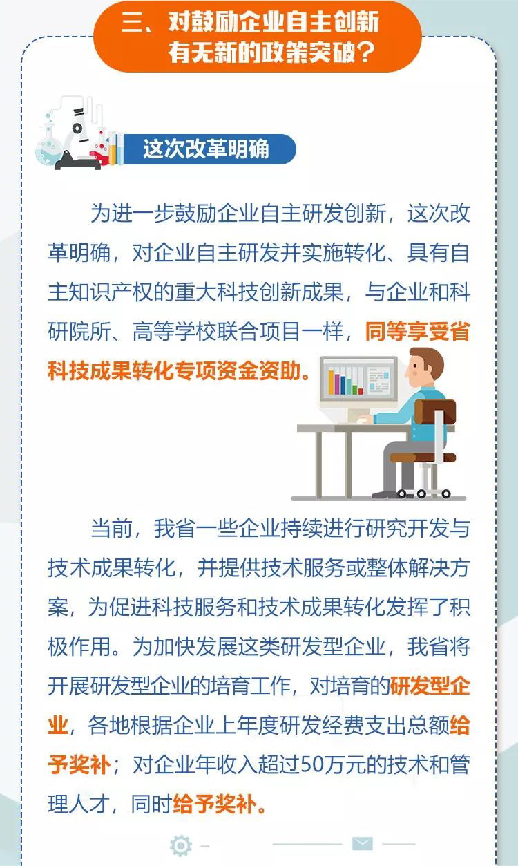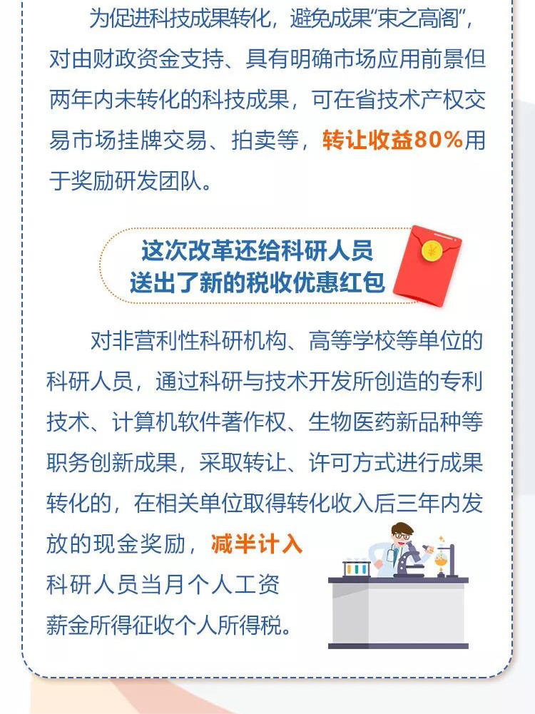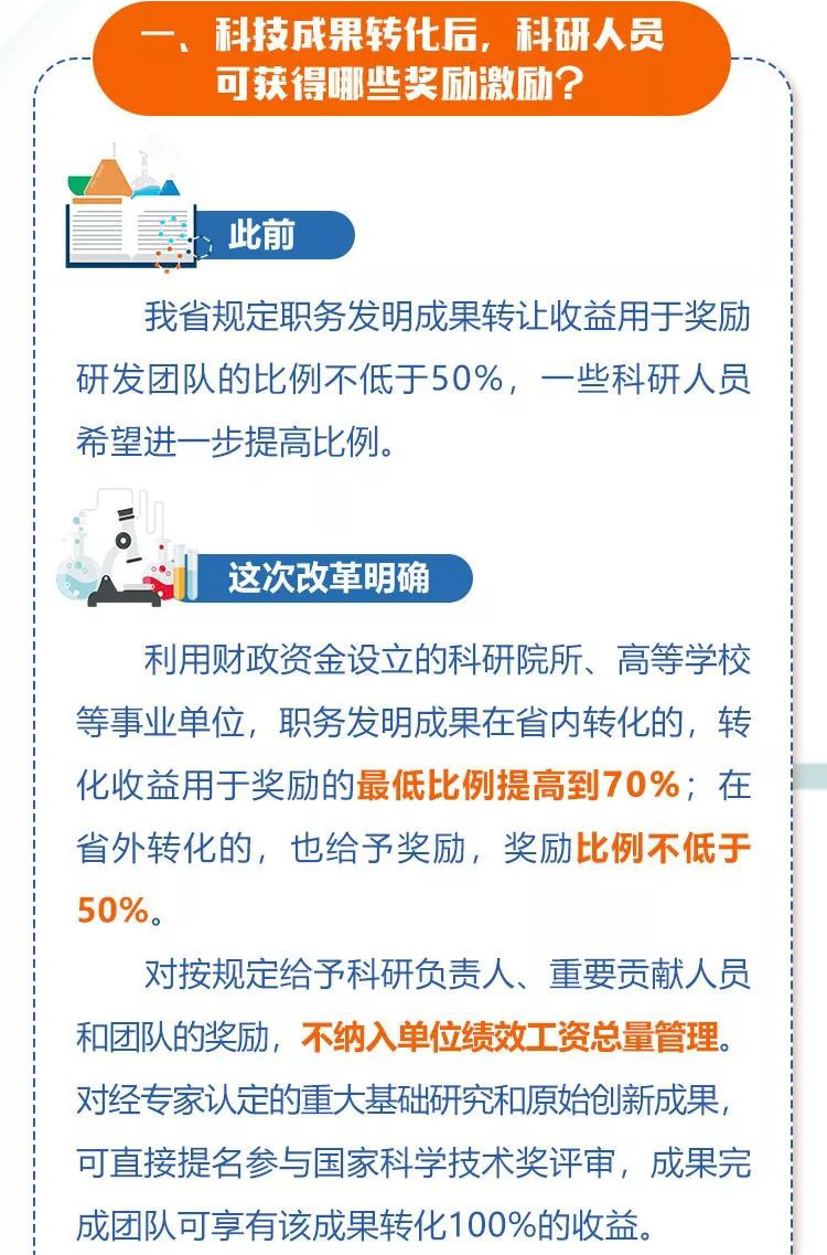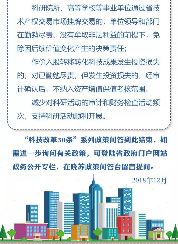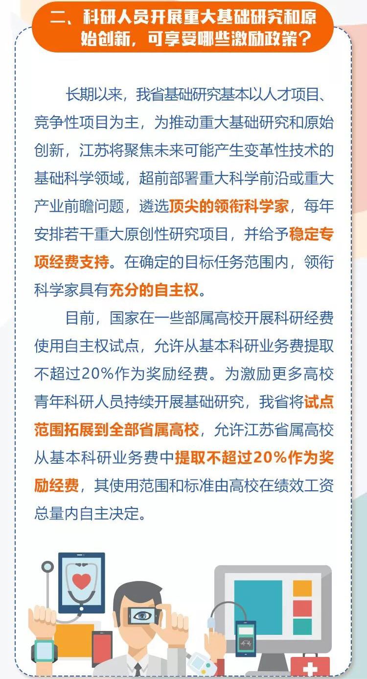 這次江蘇省委省政府出臺“科技改革30條”,進一步為科研人員簡除煩苛、“松綁”減負。那么,科技成果轉化后,科研人員可獲得哪些獎勵激勵?科研人員開展重大基礎研究和原始創新,可享受哪些激勵政策?對鼓勵企業自主創新有無新的政策突破?在激勵知識產權創造運用上有哪些扶持政策?企業和高校院所院士“雙向”設立工作站有何政策紅利?對供需兩端共享使用大型科學儀器等公共資源有何新的支持政策?在建立激勵創新寬容失敗機制上有哪些改革舉措?