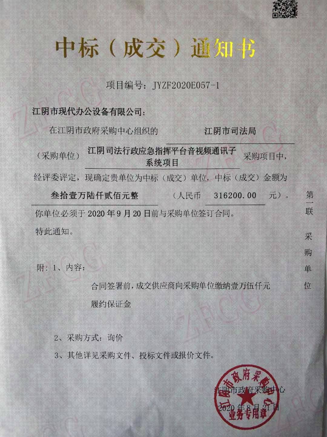 江陰市司法局應急指揮平臺音視頻通訊子系統項目詢價、成交結果公告及采購合同公開