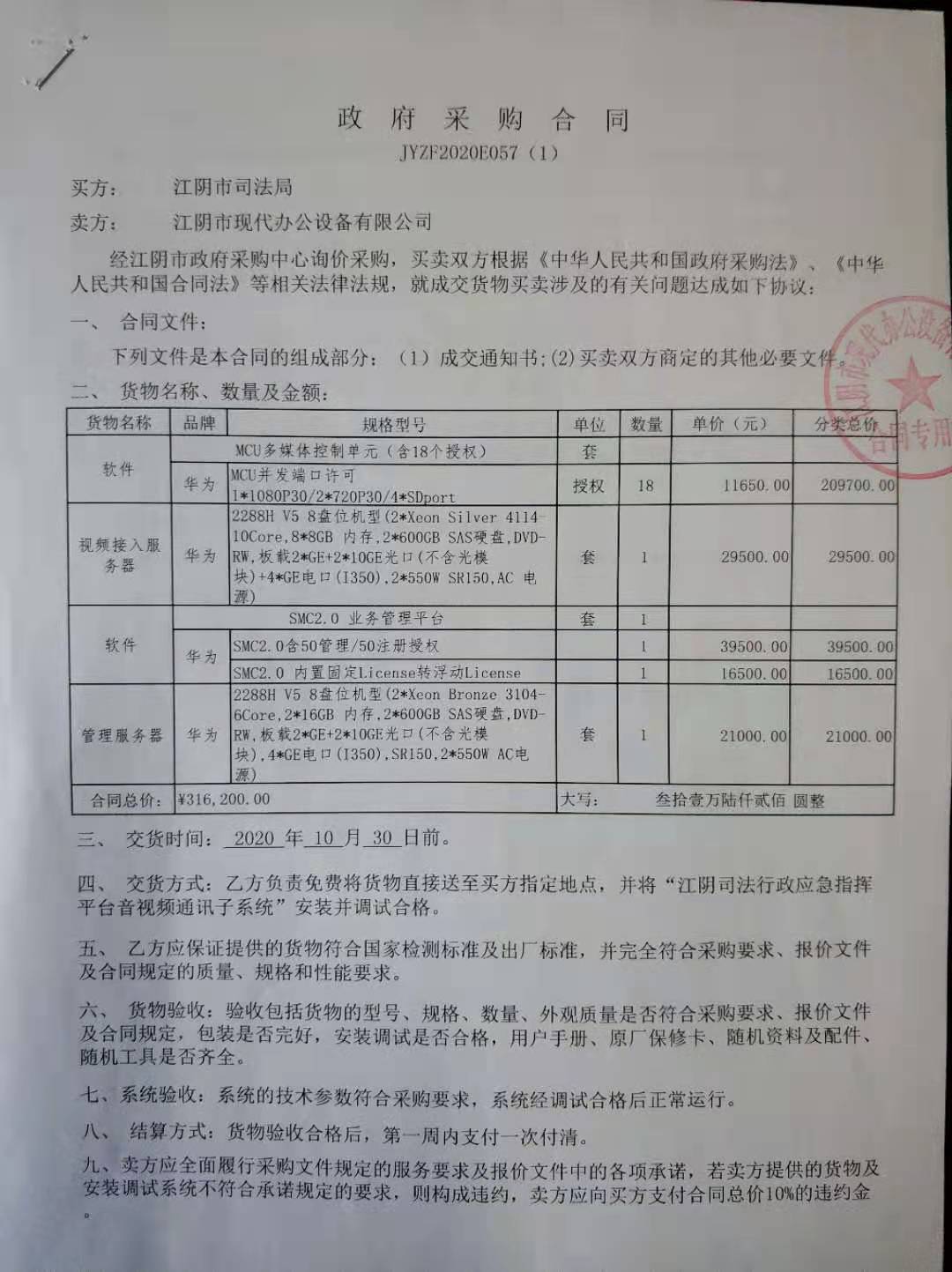 內容概述 江陰市司法局應急指揮平臺音視頻通訊子系統項目詢價及成交結果公告及采購合同公開