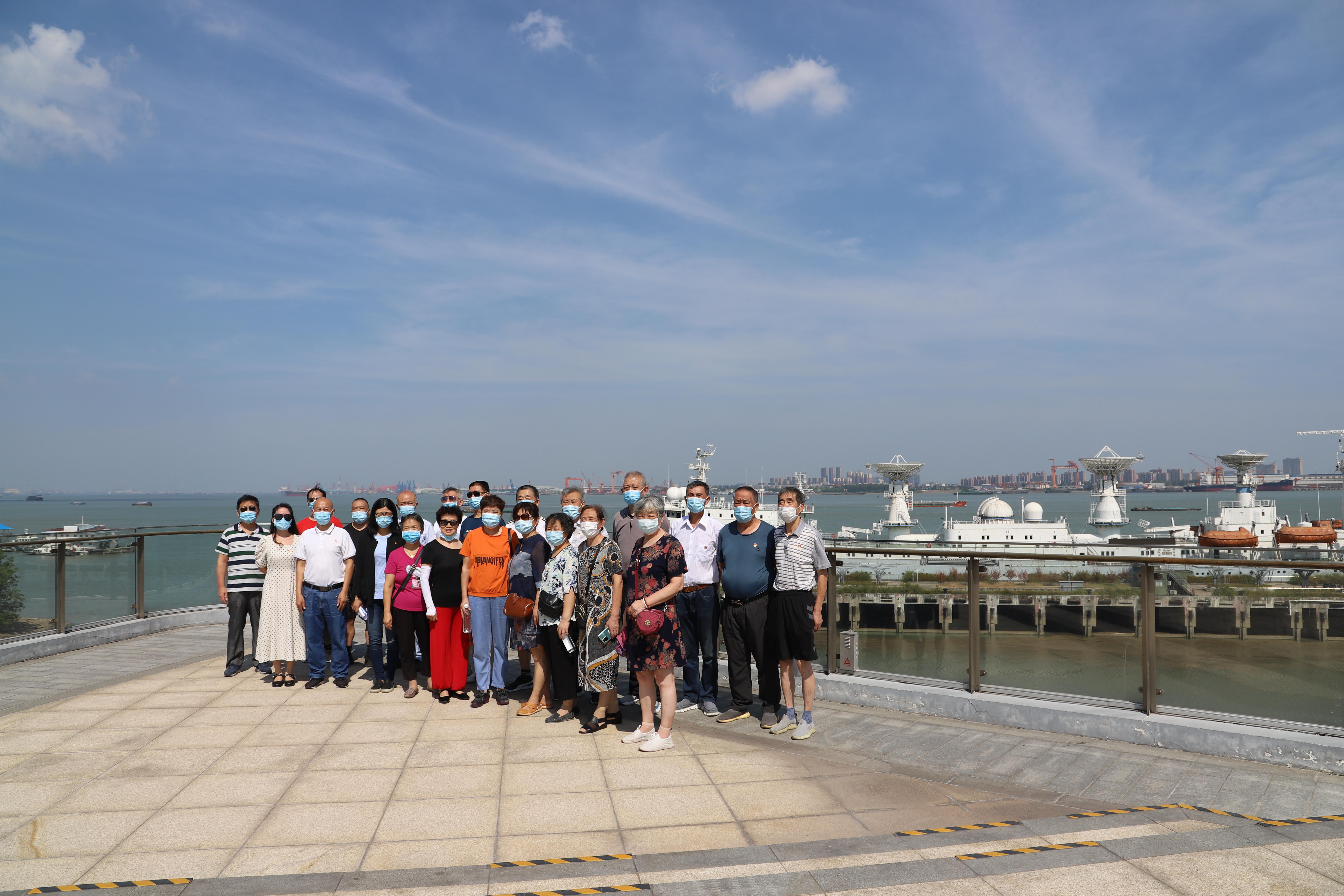 來到三樓露天陽臺,遠眺氣勢磅礴的江陰長江大橋,可以清晰看到長江周邊沿岸的鵝鼻嘴公園、江陰綠道、徐霞客雕像等自然風光。長江江面上貨輪往來不絕,已退役的遠望2號測控船??吭诮?,默默觀望著這一派繁榮、祥和的景象,仿佛無聲訴說著自己曾經的榮耀與故事。將近參觀結尾,市民代表們在這里興奮地合影留念,表達著對長江美景的贊嘆,感慨著過去與現在的變化。