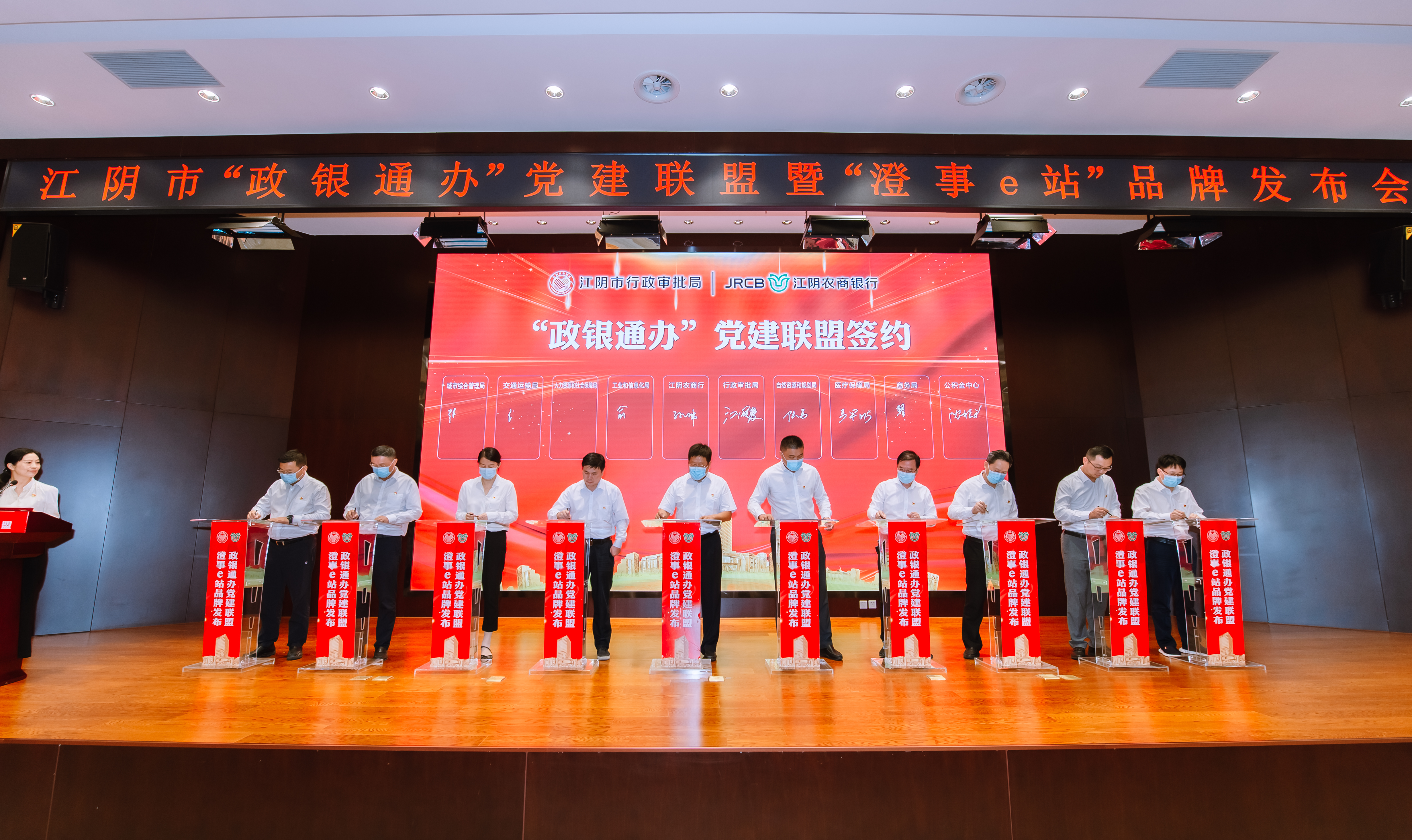 活動現場,市行政審批局黨委攜手江陰農商銀行黨委,會同9個部門黨組織,舉行了“政銀通辦”黨建聯盟簽約儀式。