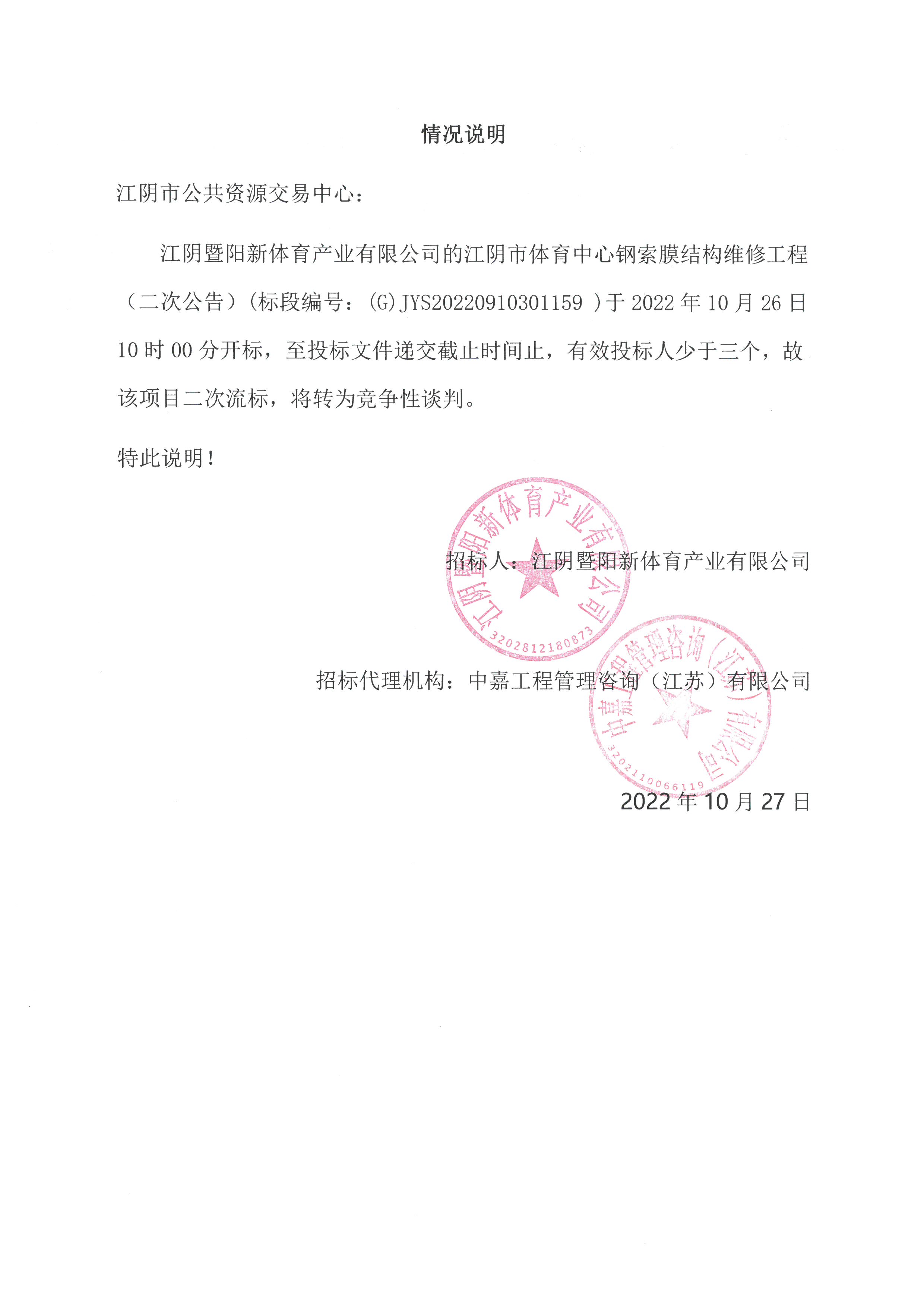 江陰暨陽新體育產業有限公司的江陰市體育中心鋼索膜結構維修工程(二次公告)(標段編號:(G)JYS20220910301159 )于2022年10月26日10時00分開標,至投標文件遞交截止時間止,有效投標人少于三個,故該項目二次流標,將轉為競爭性談判。