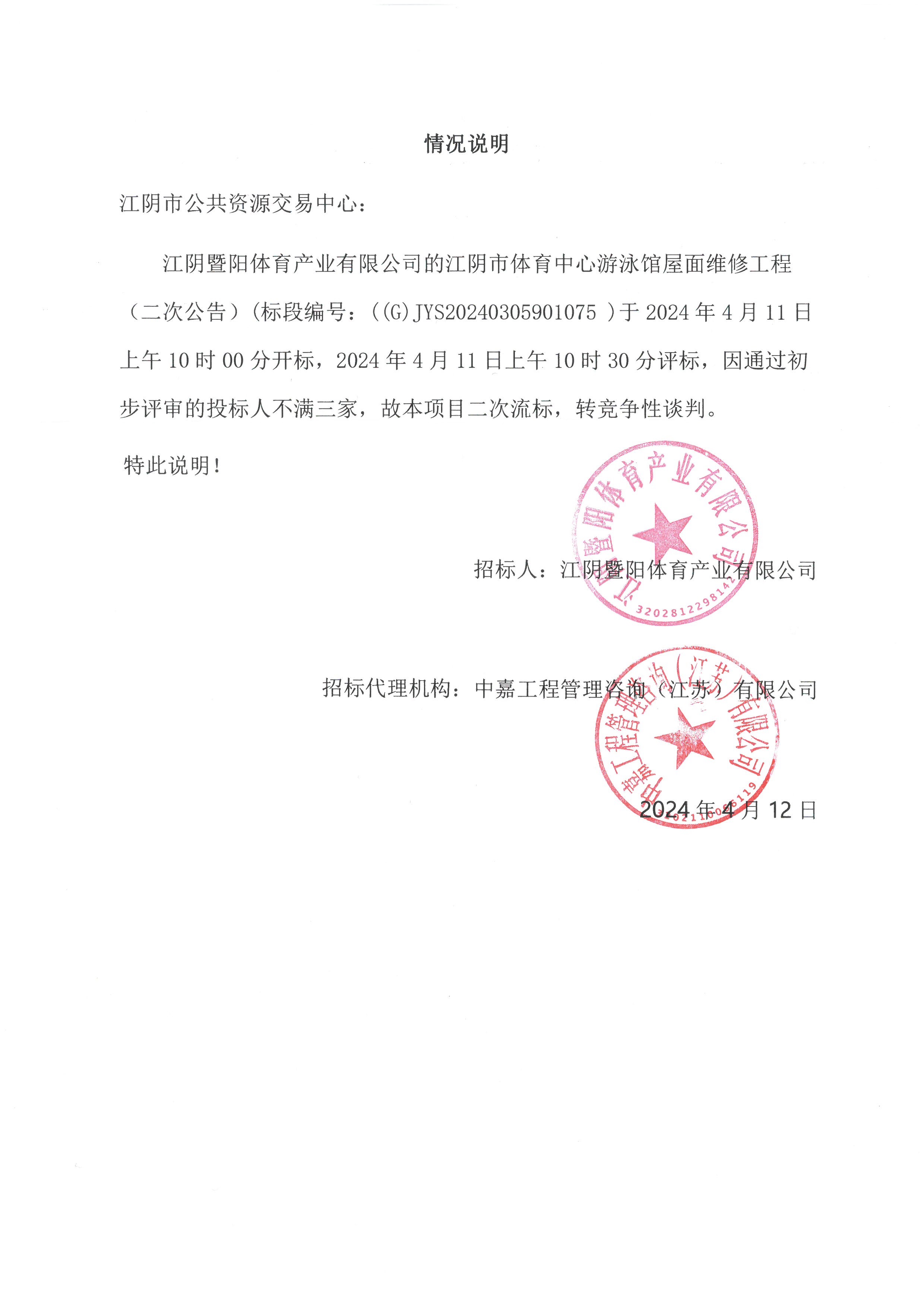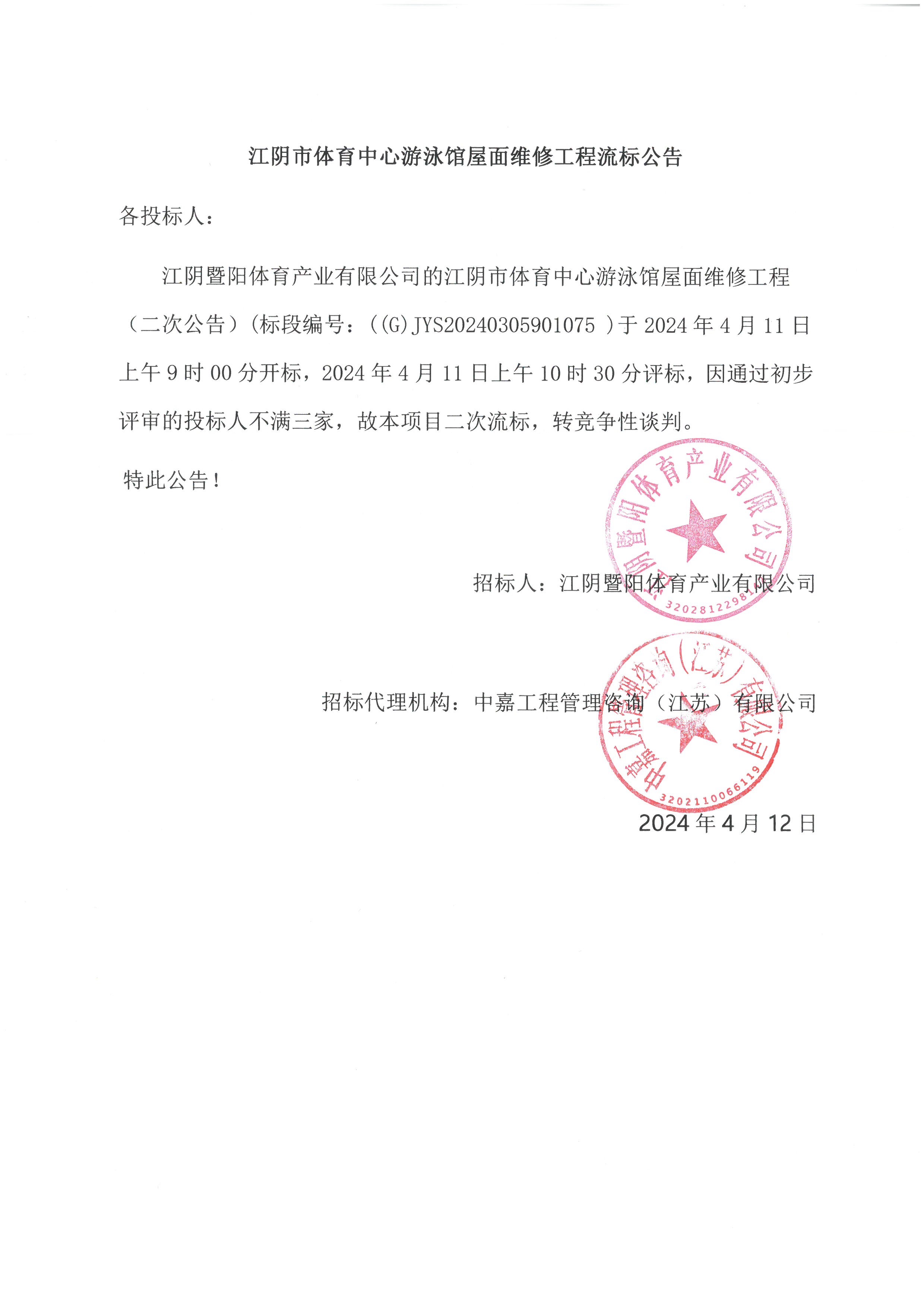 江陰暨陽體育產業有限公司江陰市體育中心游泳館屋面維修工程(二次公告(標段編號:((G)JYS20240305901075 )于2024411上午900分開標,2024年4月11日上午10時30分評標,因通過初步評審的投標人不滿三家,故本項目二次流標,轉競爭性談判。