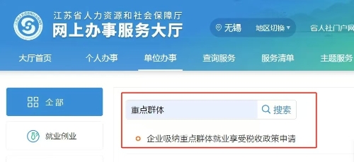地區切換選擇“無錫”,企業吸納重點群體就業享受稅收政策資格認定選擇:單位辦事—就業創業—企業吸納重點群體就業享受稅收政策申請—申報。