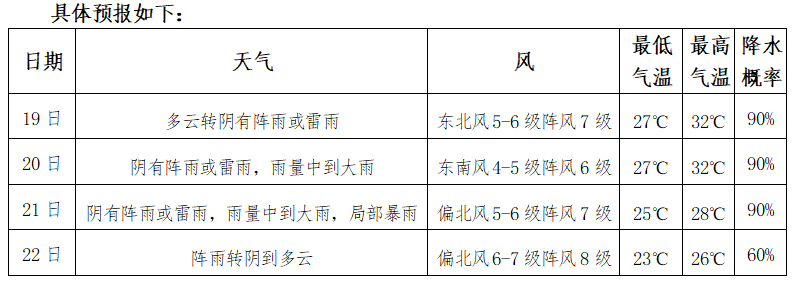受“普拉桑”外圍影響,19日我市風力明顯增強,東北風可達5-6級陣風7級,沿江江面陣風8級,20日風力有所減弱;19-21日將伴有明顯降雨,其中20-21日過程雨量可達大雨,局部暴雨,局地可能有雷電、8-10級雷暴大風等強對流天氣。受冷空氣南下影響,21日下午到22日風力將再次增強,偏北風可達6-7級陣風8級,沿江江面陣風8-9級,氣溫逐步下降。