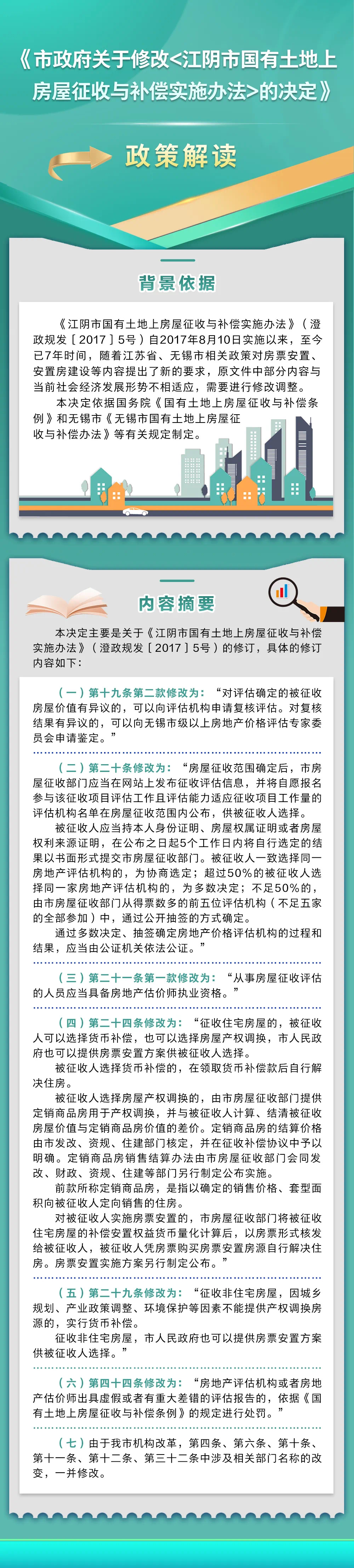 | 內容概述 | 《市政府關于修改<江陰市國有土地上房屋征收與補償實施辦法>的決定》的政策解讀 | ||||