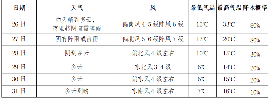 26日夜里到27日有雷雨和大風降溫天氣