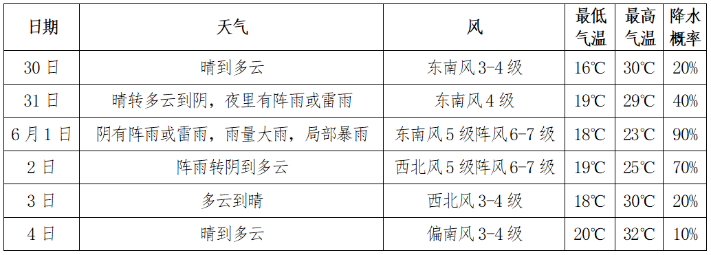 根據最新氣象資料分析,端午假期我市將有一次明顯降雨天氣過程,31日夜里降雨開始,6月1日白天到夜里雨量明顯,可達大雨,局部暴雨,2日降雨逐漸結束。1-2日將出現大風天氣,風力可達5級陣風6-7級,沿江江面陣風8級。受降雨影響,1-2日氣溫有所下降,最高氣溫23~24℃。3日起以晴到多云天氣為主,氣溫回升,最高氣溫將升至30℃以上。