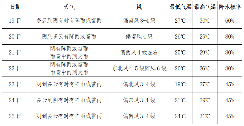 根據最新氣象資料分析,未來一周(19-25日)我市將多降雨天氣過程,有雷雨時可能伴有7-9級雷暴大風;受降雨影響,日最高氣溫多降至30℃以下。需重點關注21-22日的較強降雨天氣:雨量中雨到大雨,局部可能伴有短時強降水、雷電、雷暴大風等強對流天氣,最大小時雨強20-30毫米。