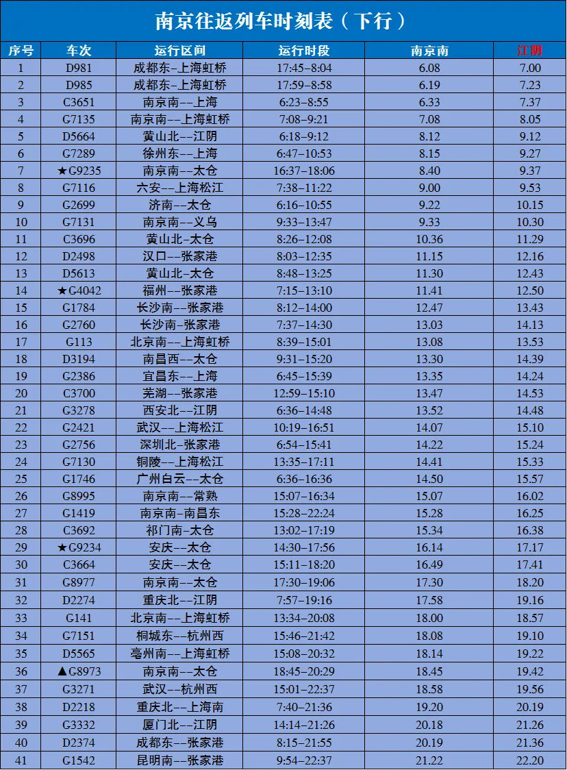 在強化通勤服務方面,新增G3330、G3332次廈門北至江陰(張家港)列車,精準匹配早高峰通勤需求——江陰、張家港旅客可乘此列車在早間高峰時段準時抵達南京南站,同時車次在晚上8點后從南京南返程,形成雙向通勤閉環。新增的D5559、D5560次江陰至上海虹橋列車,發車時刻設計更顯貼心:清晨6:23江陰開行,7:31抵達上海虹橋,晚間21:47從上海虹橋返程,一舉填補早8點前與晚9點后往返上海的通勤車次空白,為沿線居民搭建起更靈活的城際往來橋梁。