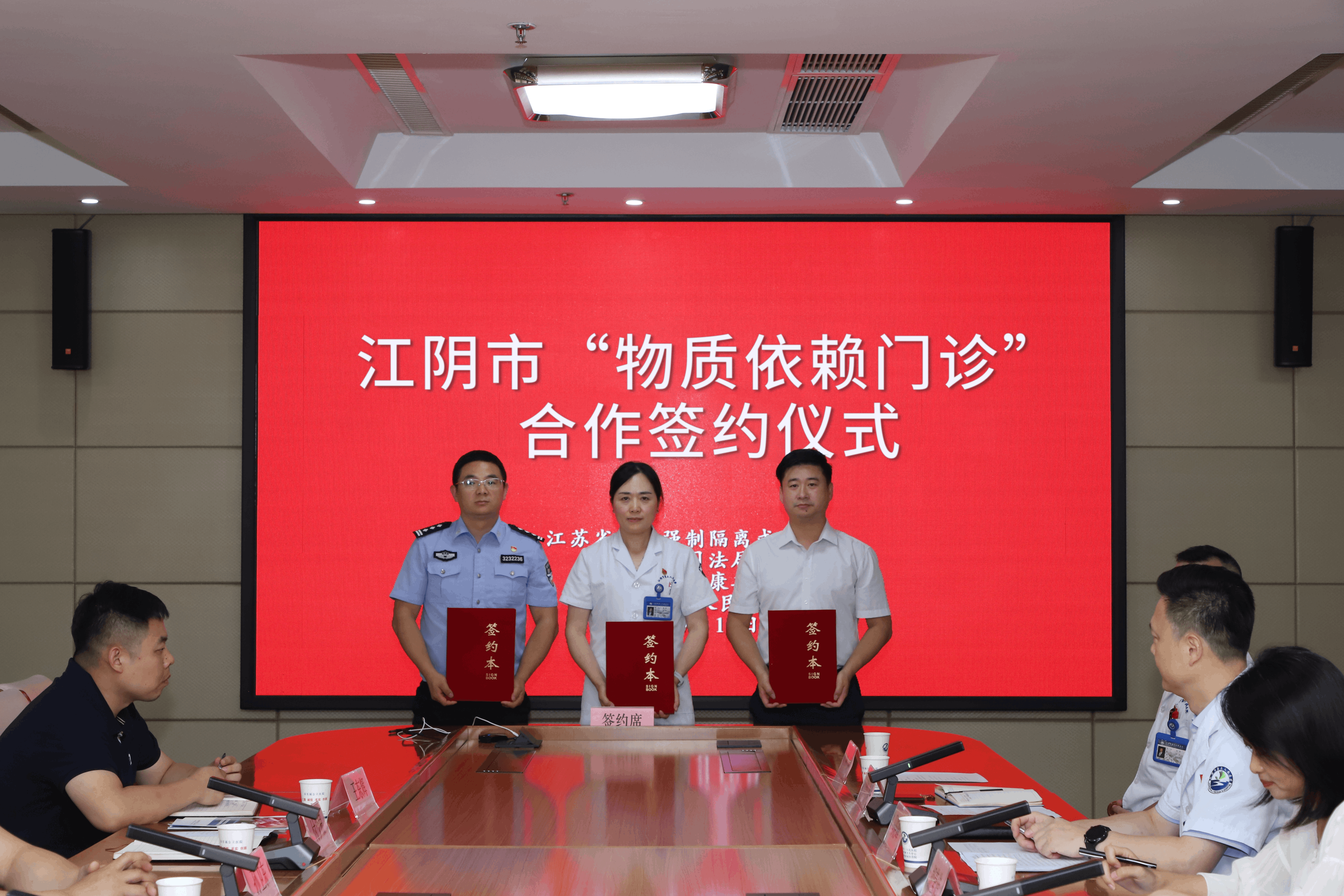 啟動儀式上,江蘇省句東強制隔離戒毒所、江陰市司法局、江陰市第三人民醫院三方代表共同簽署“物質依賴門診”合作共建協議并揭牌,標志著江陰市首個整合多方資源的專業化物質依賴診療平臺正式投入運營。