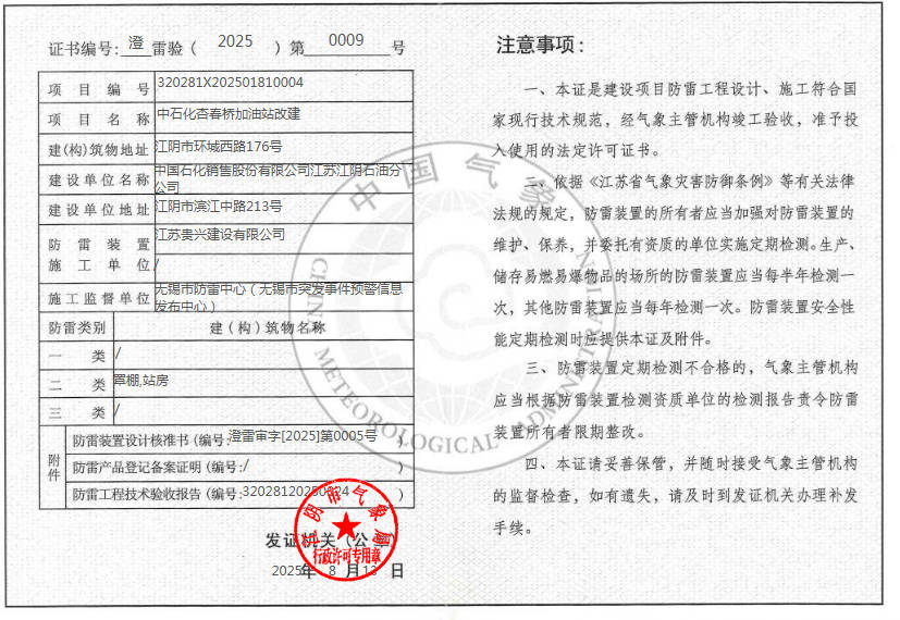 首頁>>市氣象局 > 行政權力 > 防雷裝置驗收合格證公示
