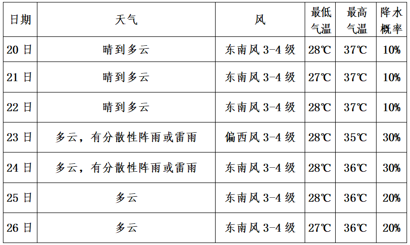 19-22日,我市晴熱少雨,23日后以多云天氣為主,偶有分散性雷陣雨。