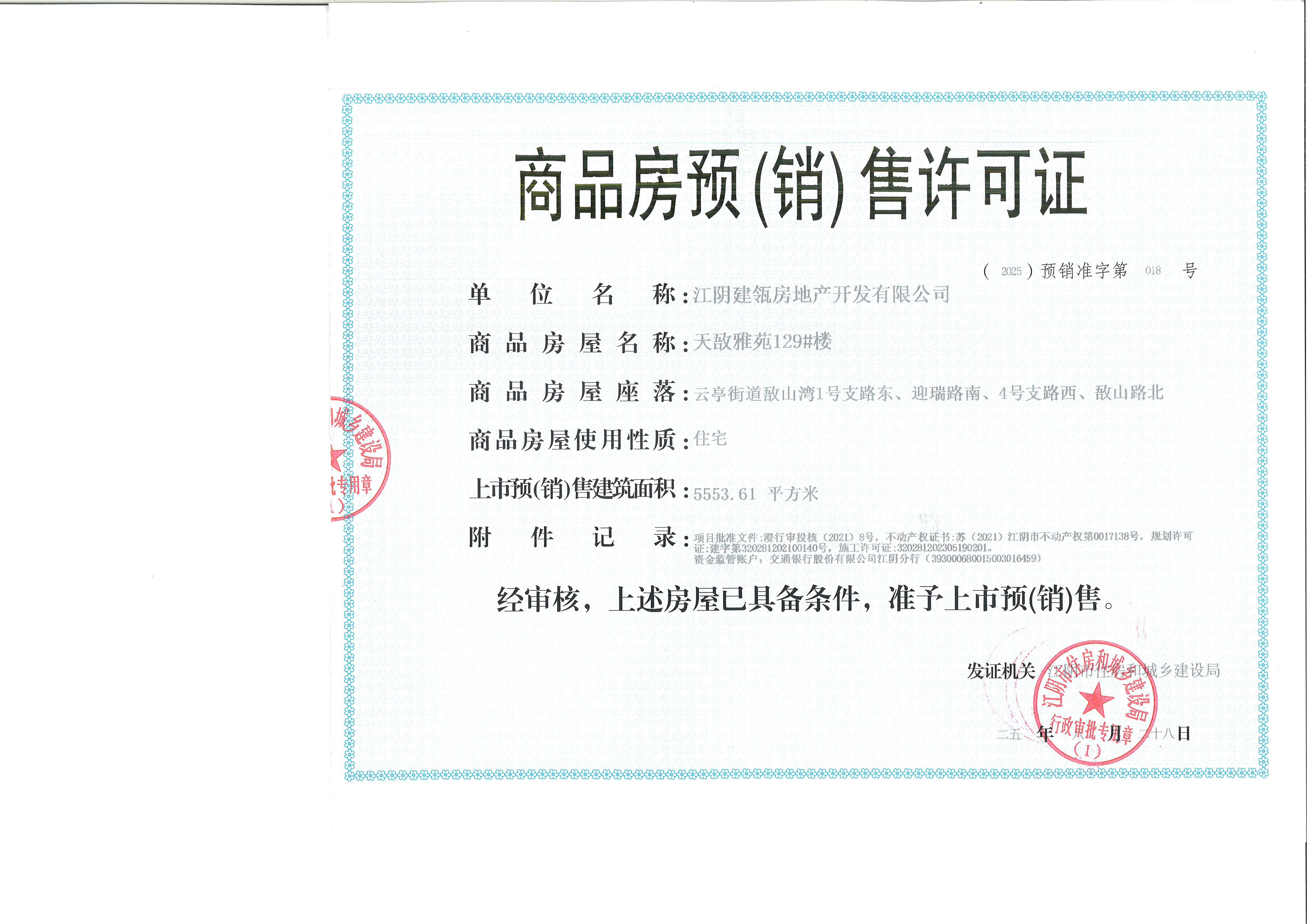 商品房預(銷)售許可證(天敔雅苑129#樓)