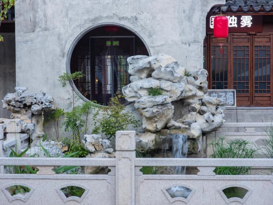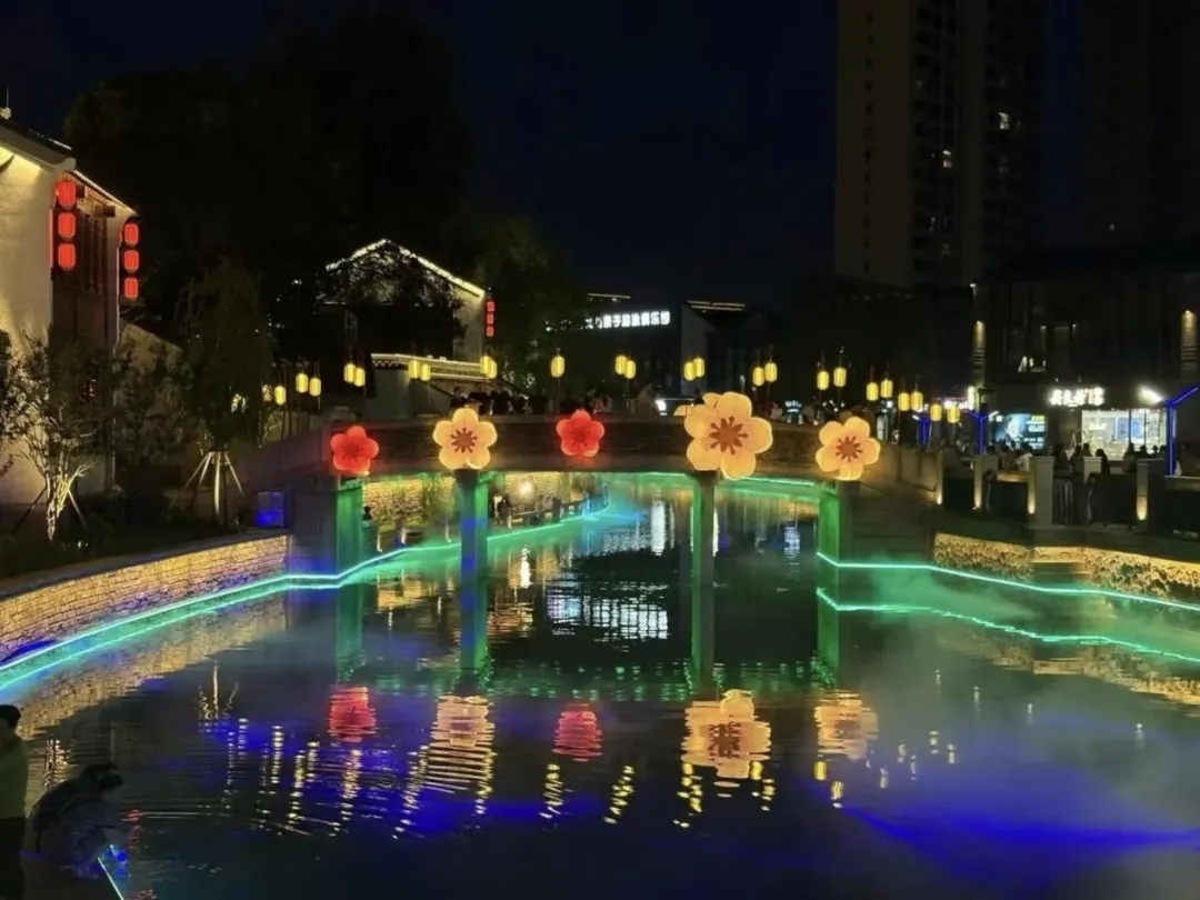 我們疊石成山、引水為瀑,用自然點綴街巷;街邊花箱與陶缸植叢,融合了藝術與生活;同時精選香樟、烏桕等鄉土樹種,通過組合造景與單點點綴,營造出靈動景觀。夜幕降臨,瓦楞燈、洗墻燈、燈籠照亮街巷,河邊射燈與霧森系統交織成光影夢幻,帶來獨特夜游體驗。