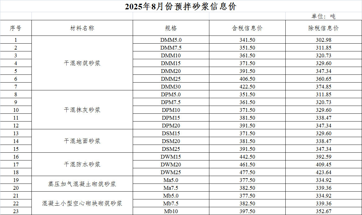 2025年8月份預拌砂漿信息價