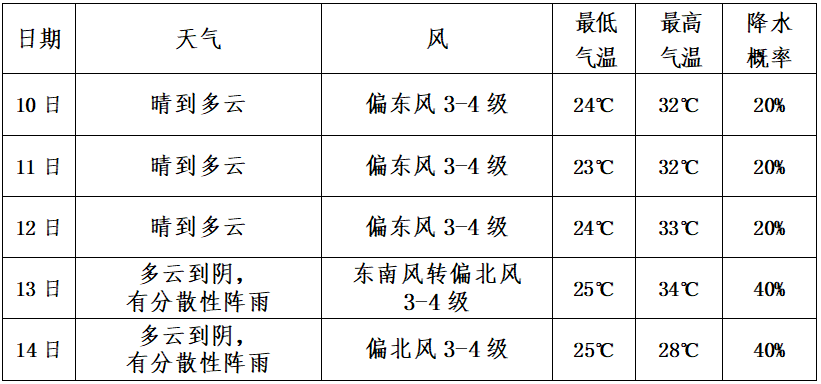 據最新氣象資料顯示,未來幾天我市以云系變化為主,10-12日晴到多云,13-14日云系增多,天氣變為多云到陰,有分散性陣雨。10-13日氣溫在23℃到34℃,14日最高氣溫有所降低,請注意防范。