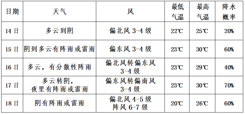 據最新氣象資料顯示,今日有弱冷空氣南下,受其影響,14日氣溫有所降低,15-17日氣溫小幅回升,最高氣溫維持在30℃左右,18日最高氣溫再次降低;15日起,我市多陣雨或雷雨天氣,請注意防范。