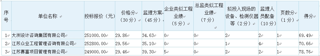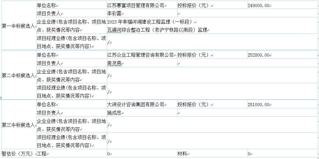 根據工程招標投標的有關法律、法規、規章和該工程招標文件的規定,江陰市秦望山工業供水有限公司、江陰水韻新城建設投資有限公司的月城鎮2025年美麗幸福河湖建設項目工程監理的評標工作已經結束,評標結果已經確定。本項目采用綜合評估法的評標辦法,現將評標結果公示如下: