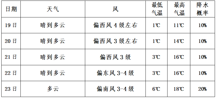 據最新氣象資料顯示,未來幾天我市以晴到多云天氣為主,氣溫逐步回升,但早晨最低氣溫仍然偏低,最低氣溫出現在19和20日,僅有1℃左右,請注意防范。